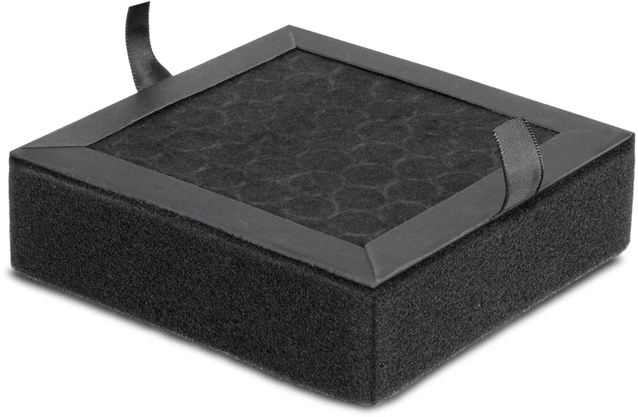 - Für stärkere Geruchsreduktion kann der Vorfilter durch eine zweite Aktivkohleschicht ersetzt werden. In staubigen Umgebungen empfiehlt es sich, den Vorfilter beizubehalten und die Aktivkohle häufiger zu wechseln.