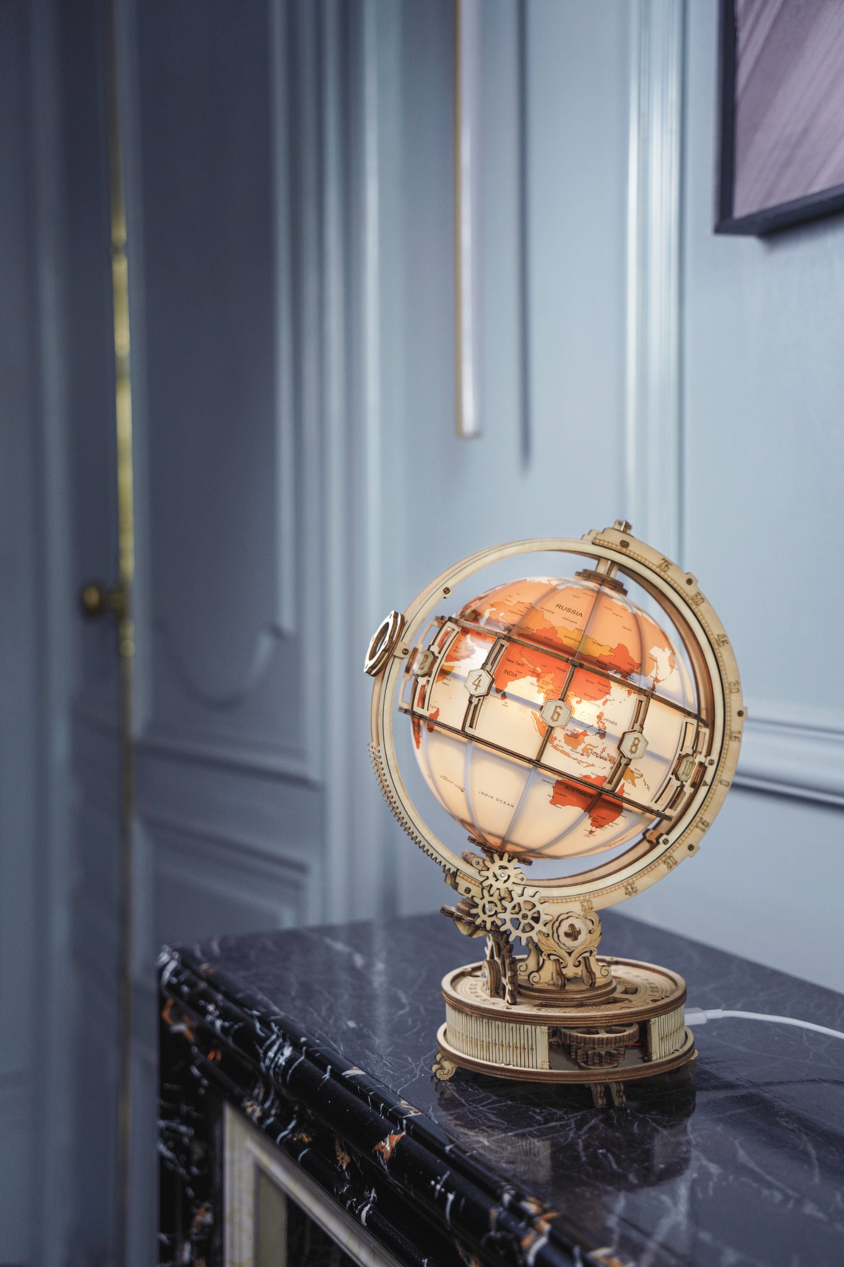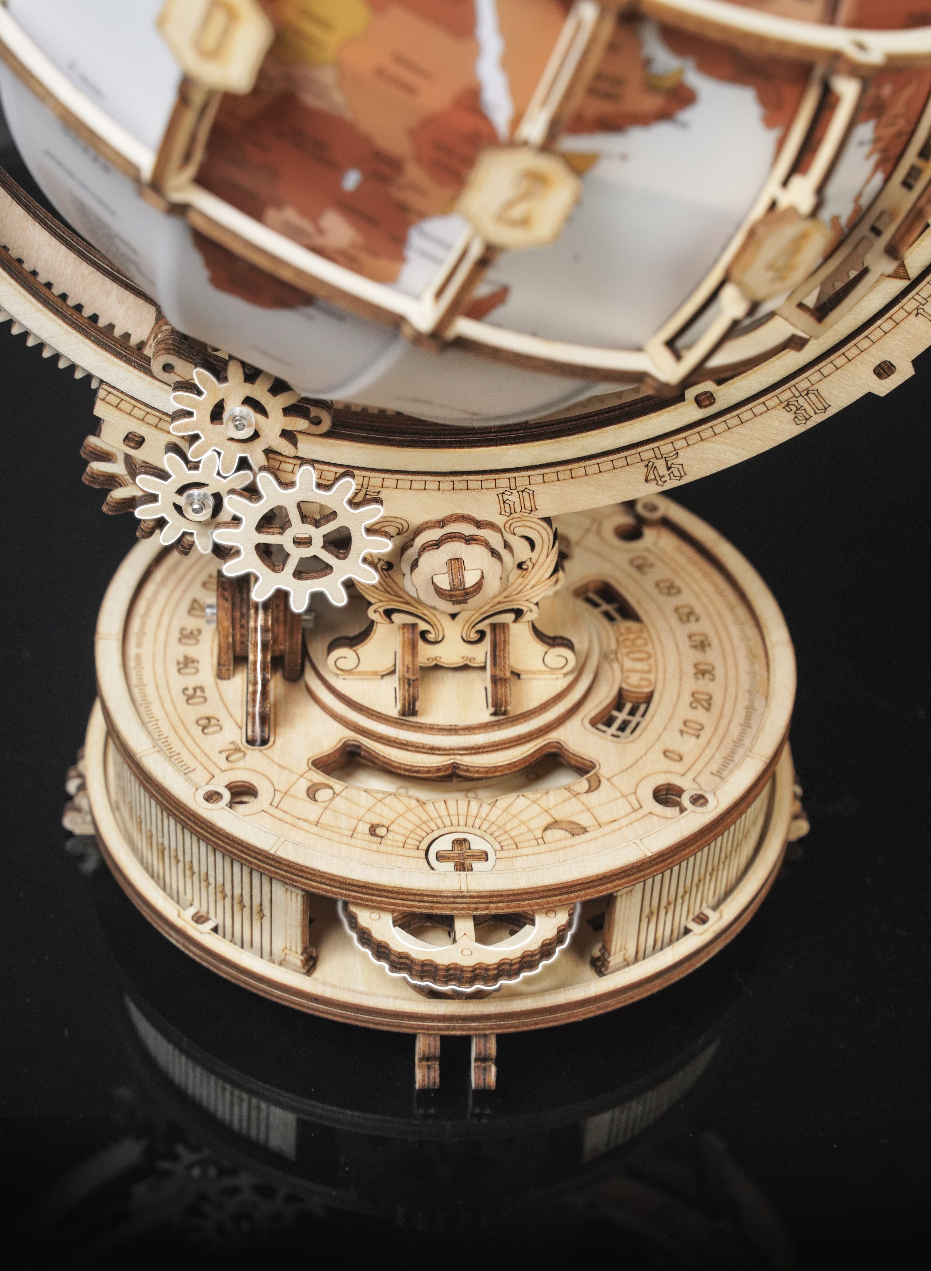 Eine mechanische Reise: Im Inneren der Basis arbeitet ein zahnradgetriebener Mechanismus, der die sanfte Drehbewegung des Globus ermöglicht. Keine versteckte Technik, sondern Mechanik, die gesehen und verstanden werden darf.