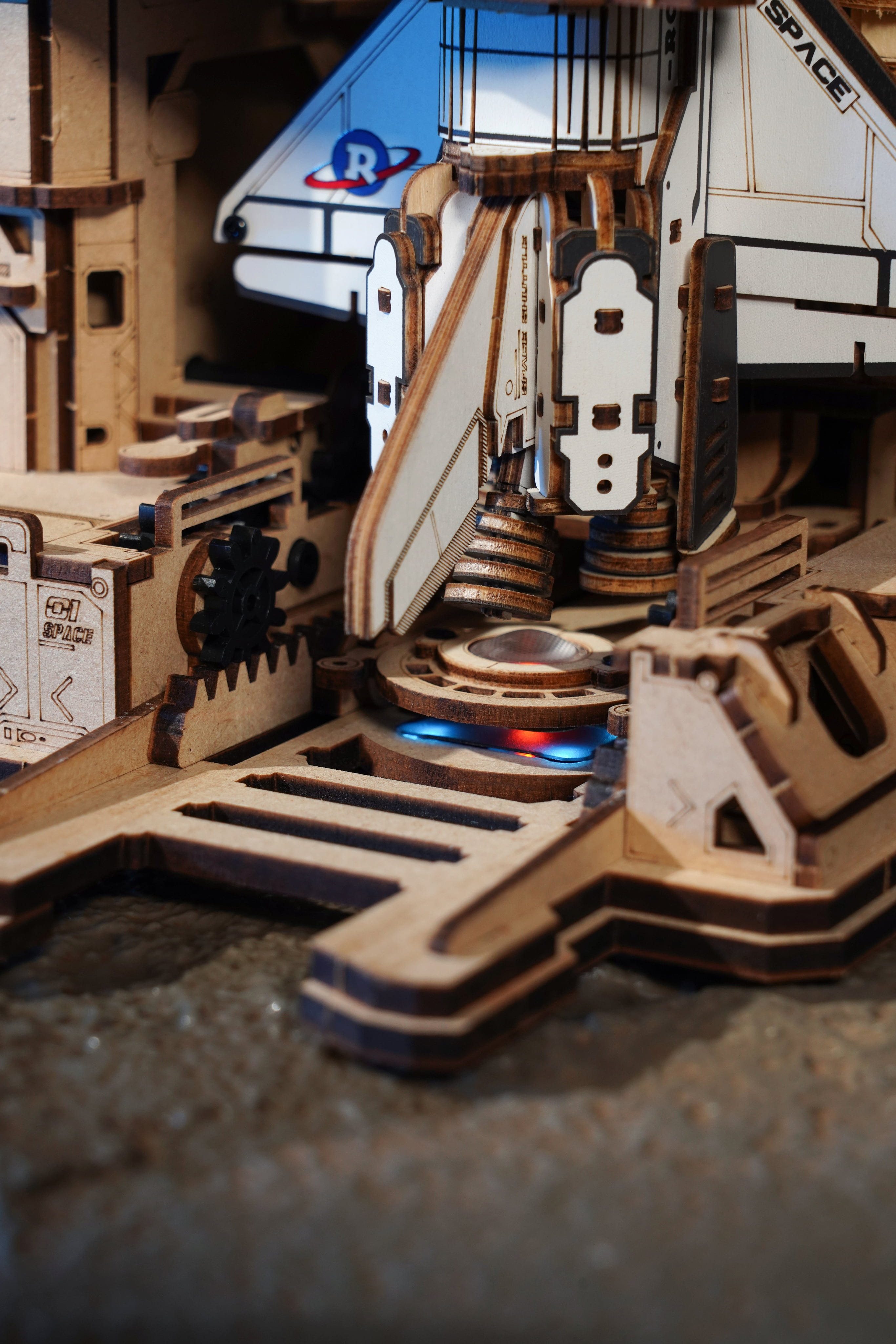 Eine Ikone aus Holz: Das Shuttle selbst orientiert sich am klassischen Orbiter-Profil: Zwillingsbooster, weiße Paneele, Deltaflügel, Heckflossenstabilisator und der charakteristisch abgerundete Bug. Jedes Detail erinnert an echte Missionen, echte Starts und echte Raumfahrtgeschichte.