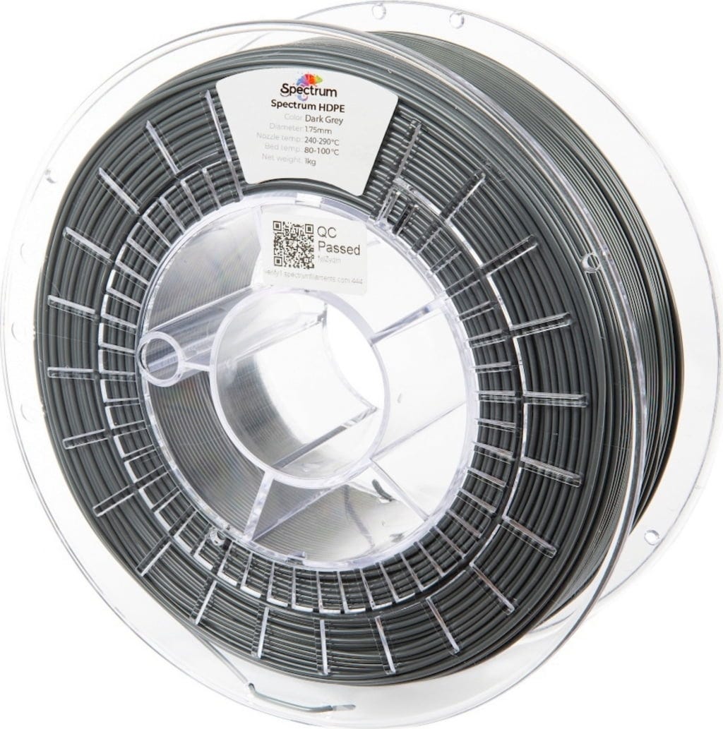 Spectrum HDPE è uno dei primi filamenti HDPE al mondo con una formulazione innovativa a bassa deformazione. Il polietilene ad alta densità è tradizionalmente considerato difficile da stampare, ma Spectrum ha ripensato completamente il materiale. Il risultato è un filamento tecnico ad alte prestazioni, estremamente resistente, stabile dal punto di vista chimico e sorprendentemente semplice da lavorare.