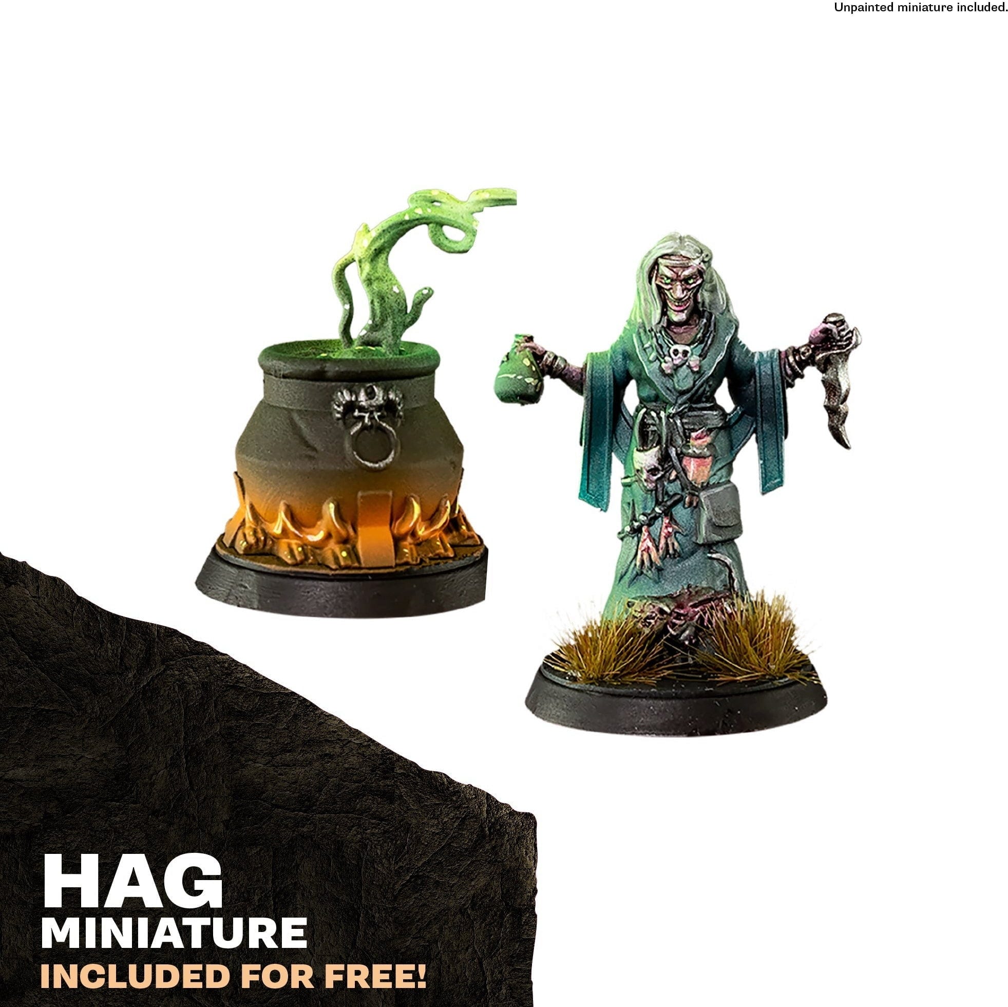 Questo set è l'ingresso in un mondo fatto di magia, oscurità e storie da raccontare. Al centro trovi una miniatura di hag con calderone, che puoi assemblare e dipingere senza l'uso di colla grazie al design snap-fit.